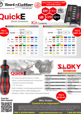1 Page Flyer - Introducing the "QuickE" Electronic Torque Screwdriver System From Sloky - Features a Rechargeable Li-ion Battery and Built-in LED Light - Can be Used in "Manual" OR "Electric" Mode - Pricing in Effect Until Further Notice.