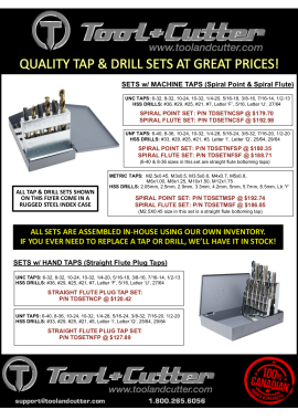 1 Page Flyer - Great Prices on Quality Tap & Drill Sets - These Are Assembled In-House From Our Own Brand-Name Inventory - Should You Ever Need to Replace a Tap or Drill in The Set, We WILL Have It In Stock! Pricing Valid Until Further Notice.